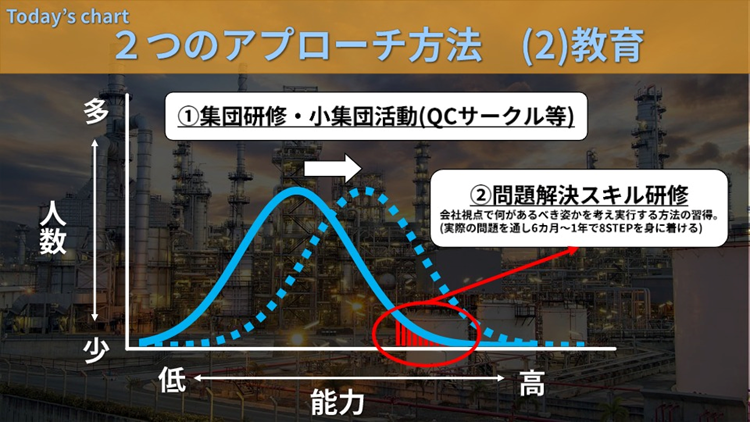 もっとレベルの高い人や次期リーダーと期待している人のためには個人テーマ、経営者の取り組みたい課題など、高いレベルの課題に対しての問題解決教育という個人のスキルアップにつながる教育や活動が必要です。